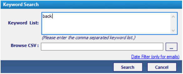Step 2: A “Keyword Search” window will open. In the “Keyword List” column, the user can enter multiple keywords to find the evidence files related to keywords. It also provides an option “Browse CSV” that we can use to add the list of keywords in CSV format. Then, click on the “Search” tab.