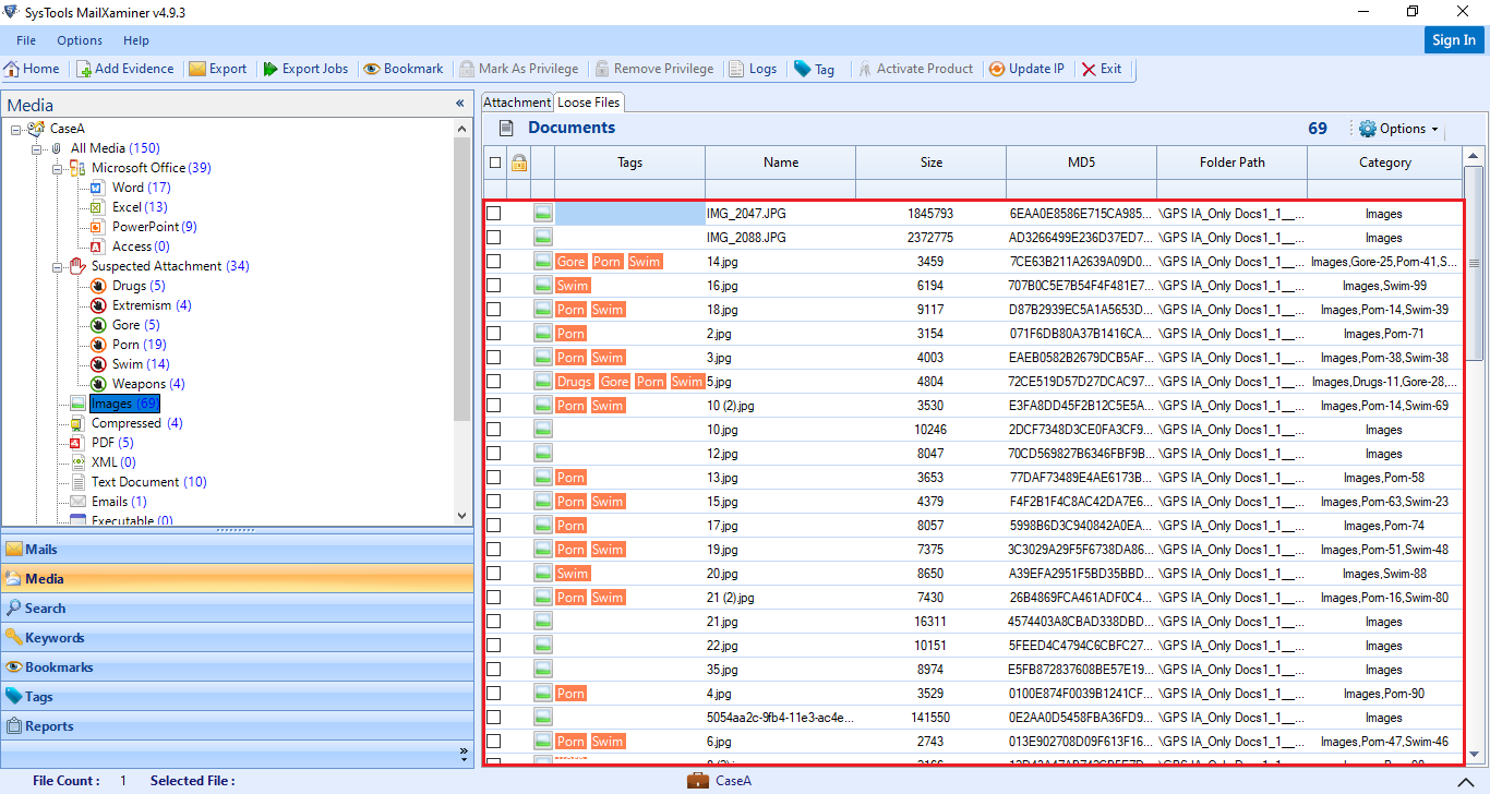 After adding evidence files into the software, go to the“Media” section that displays all the available media item attachments within the scanned mailbox repository.